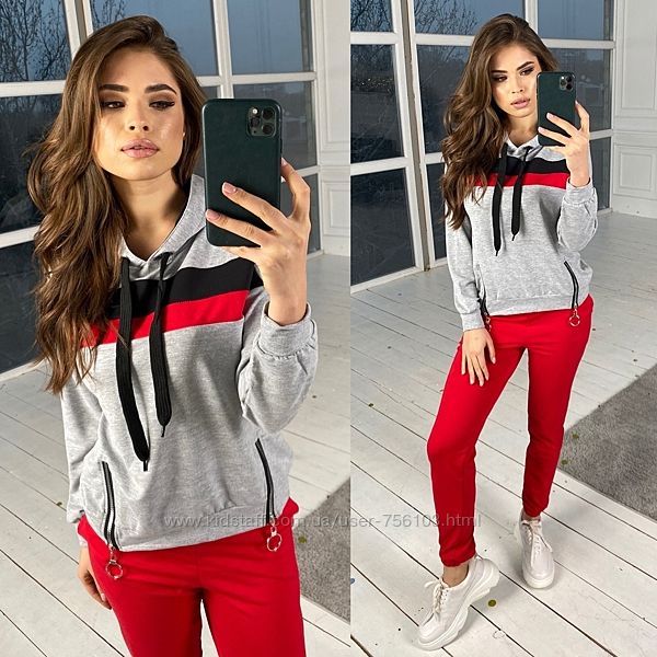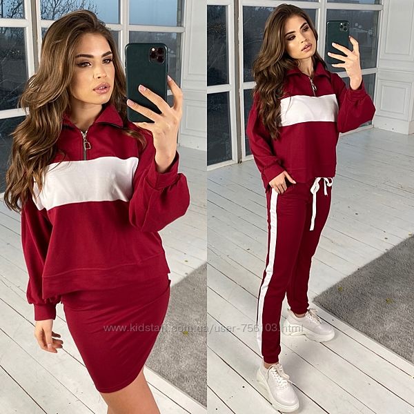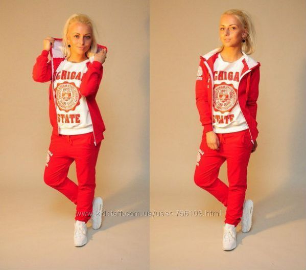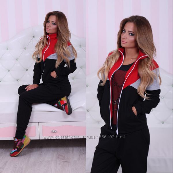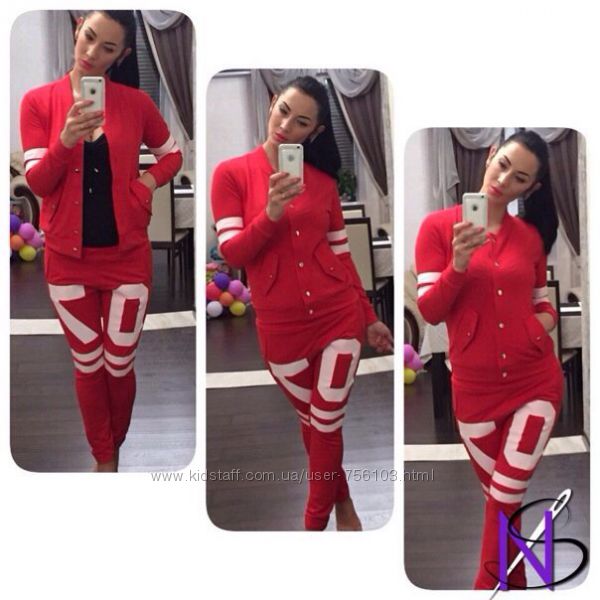 АЛ 08300 Костюм тройка(штаны+футболка+бомбер) Ткань джерси Размеры 42-44 44-46 48-50 50-52 52-54 Цвета красный костюм(чёрная футболка) Чёрный костюм(красная футболка) В продаже также мужской аналогичный костюм.