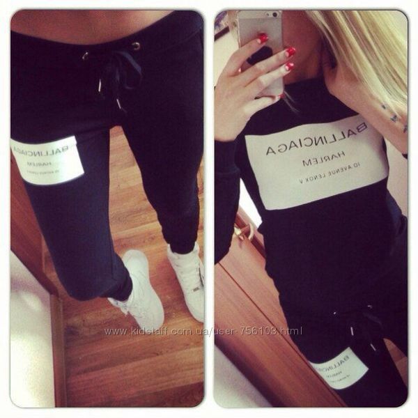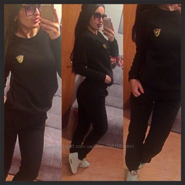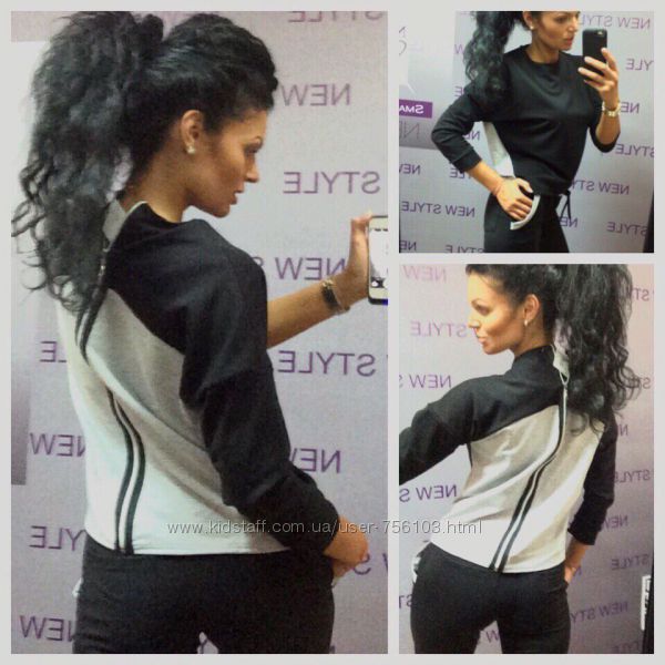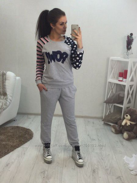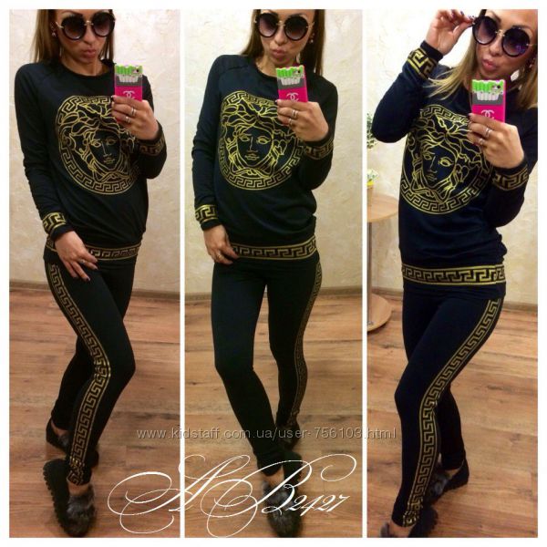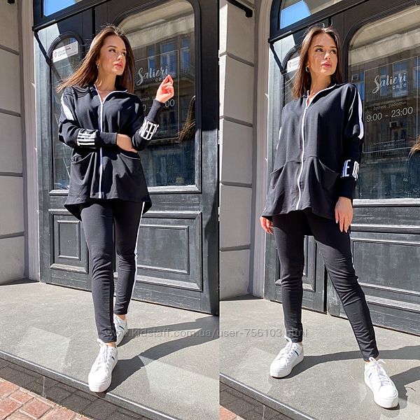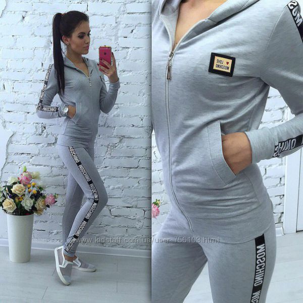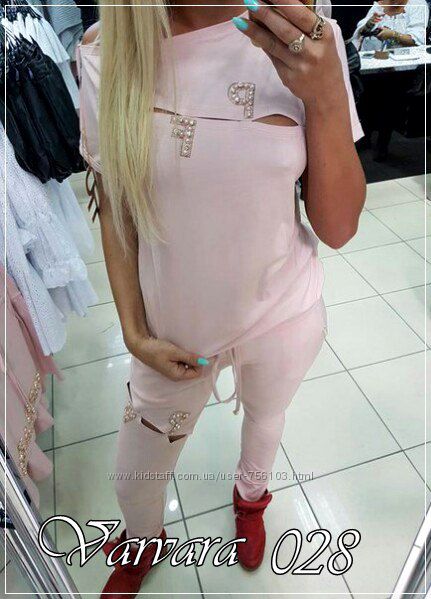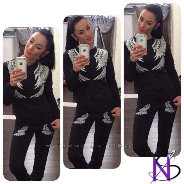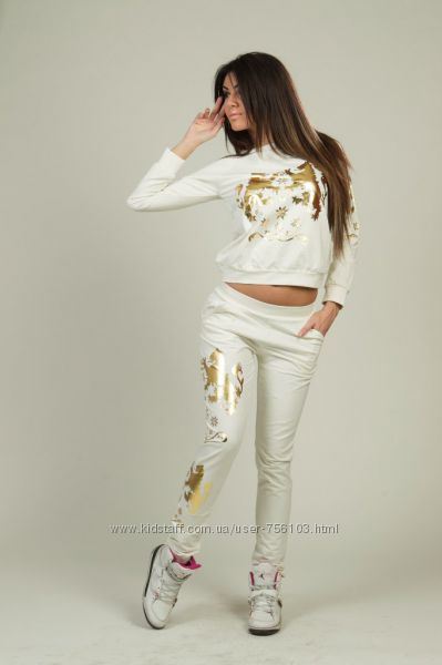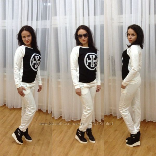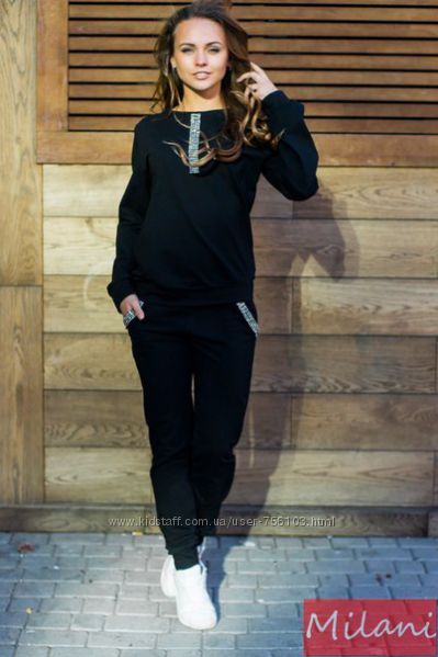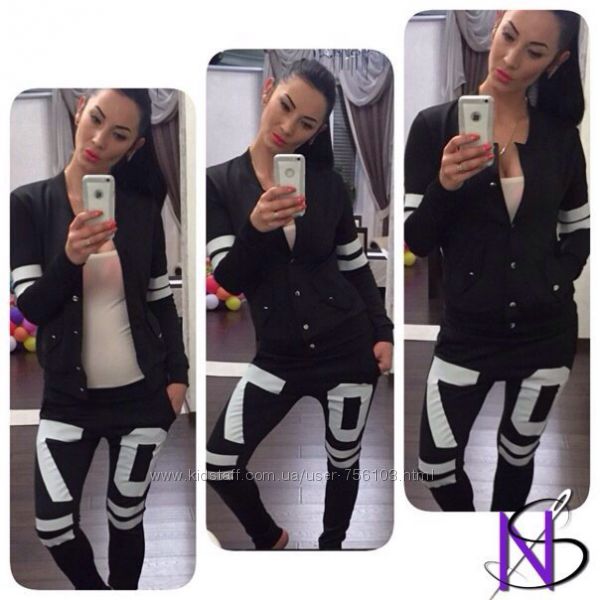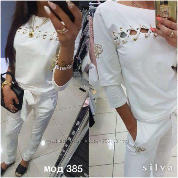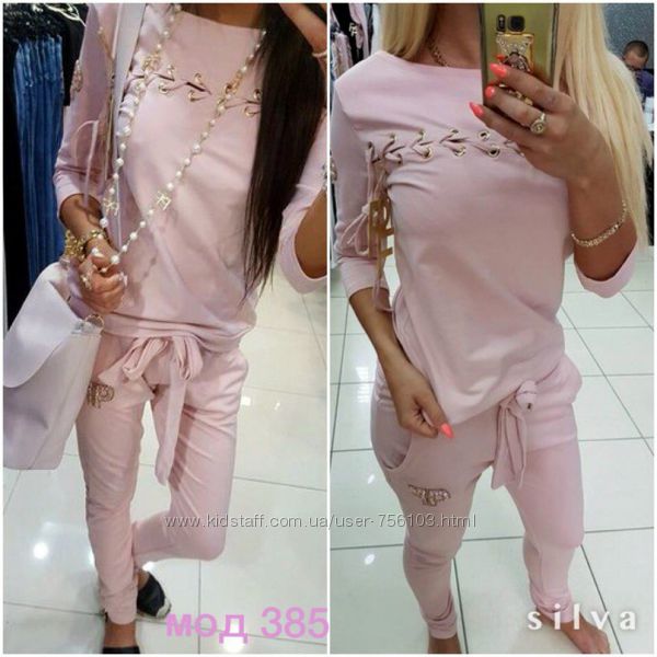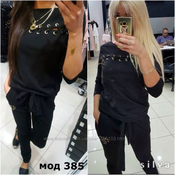 НН мод №385 Размер: с-м, м-л, 48-50, 52-54 4-цвета, черный, белый, пудра, серый. Украшения люверсы в золоте, апликации на рукаве и на штанах Ткань: трикотаж