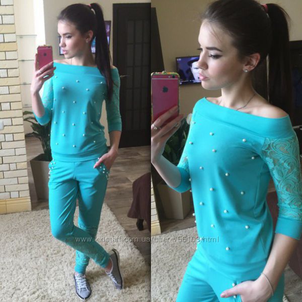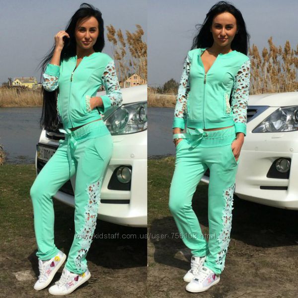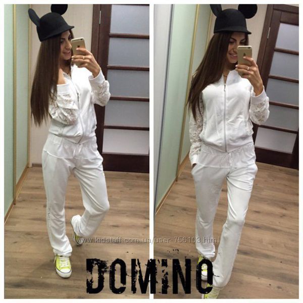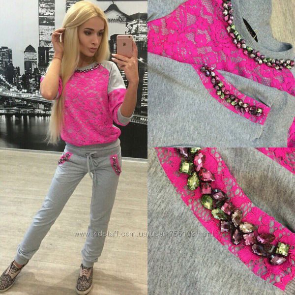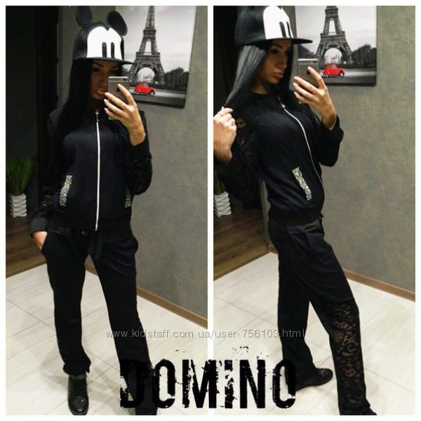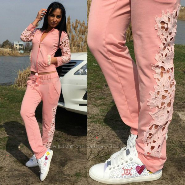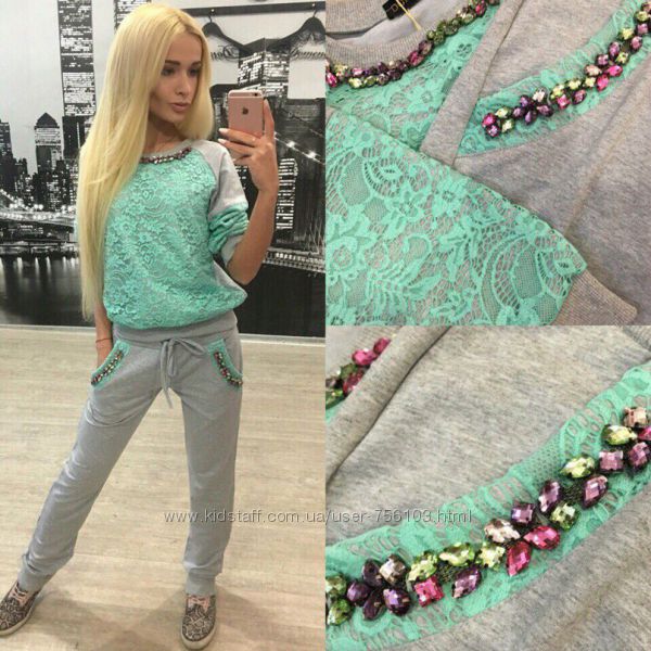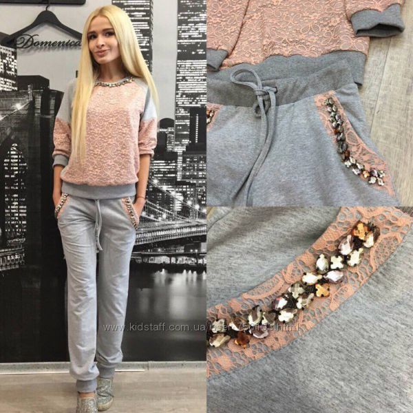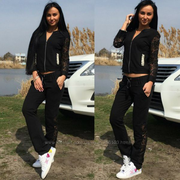 Р 1236 Спортивный костюм Ткань: Турецкая Двунитка, вставки из кружева и турецкой рибаны Отделка из дорогих камней svarovski Размер: С и М Большой размер под заказ
