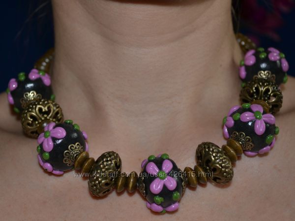 Колье Лісова Мавка.Цена 150,00грн. Описание: полимерная глина (произв.: Япония, нетоксич.),вощеный хлопковый шнур, качеств. фурнитура(медь),стеклянные и деревянные бусины,атласная лента. Длина 40 см( при необходимости, можно удлинить за счет ленты).