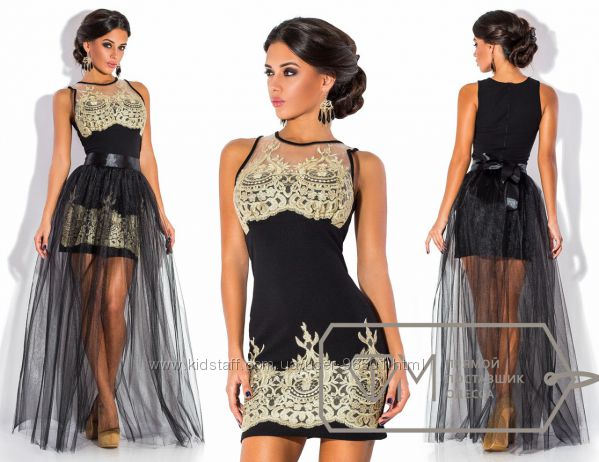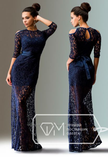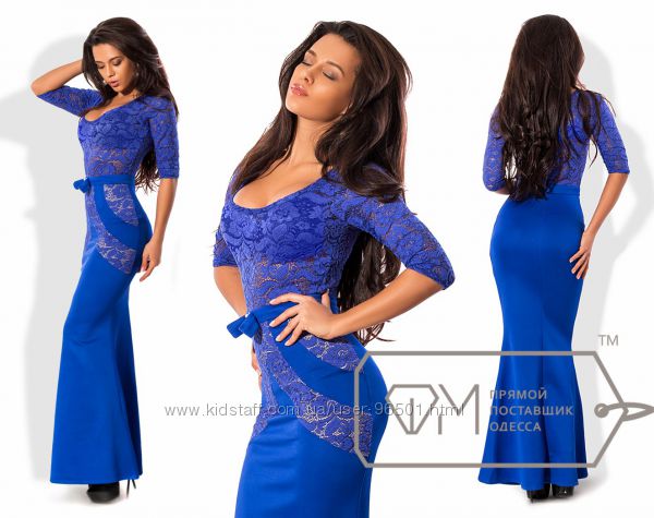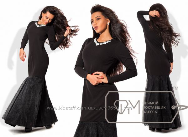 Модель № : 8340 Цена: опт 530 грн Размеры: S, M, L Ткань: креп-дайвинг + стрейч-гипюр Длина: 150 см