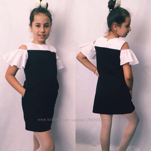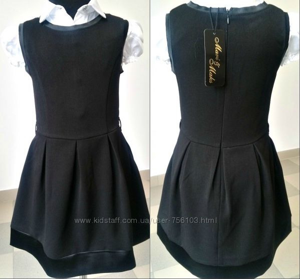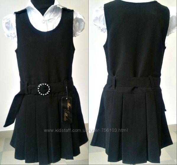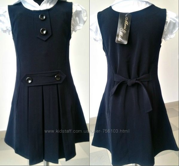 Платье -сарафан Ткань;мадонна низ синяя и чёрная и верх х/б Брошка на груди , два рабочих карманы Декорировано крабиками Рост;122;128;134;140;146