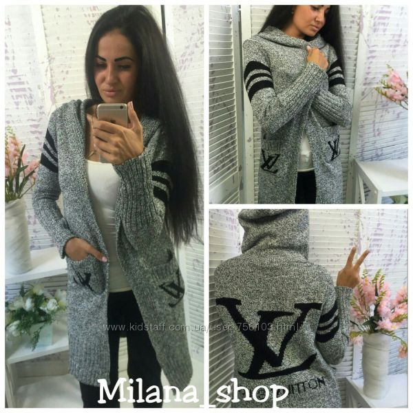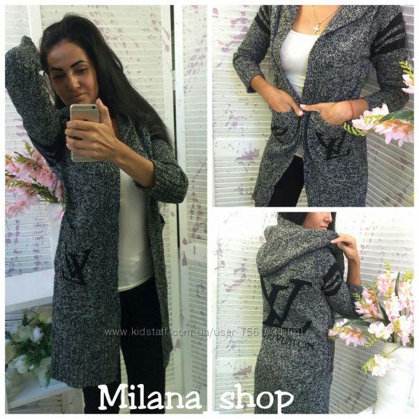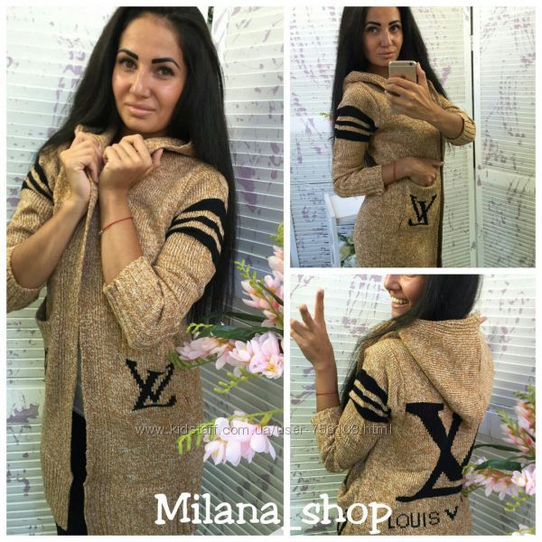 МД Код товара:1101 Кардиган LOUIS VUITTON С капюшоном. Размер единый ( 42-46 ) Длина: 90 см. Рукав: 63 см. Ткань: Трикотаж ( вязка )
