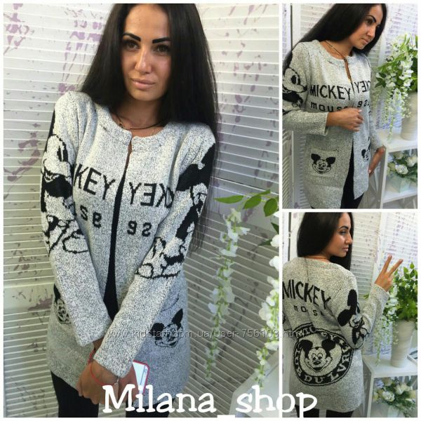 МД Код товара:1106 Кардиган MICKEY MOUSE. С карманами. Размер единый ( 42-46 ) Длина: 80 см. Рукав :62 см. Ткань : Трикотаж ( вязка ) Цвет : серый, светло-серый.
