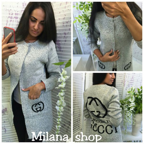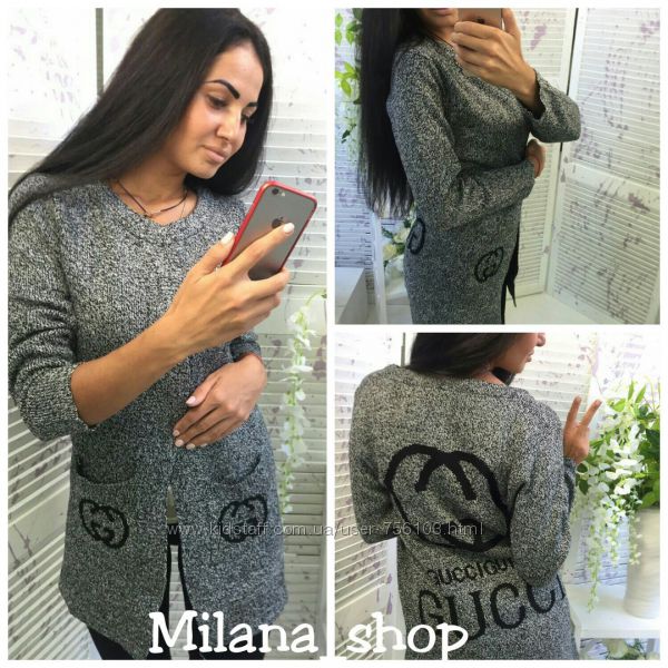 МД Код товара:1104 Кардиган GUCCI. С карманами. Размер единый ( 42-46 ) Длина: 80 см. Рукав :57 см. Ткань : Трикотаж ( вязка ) Цвет : серый, светло-серый.