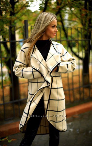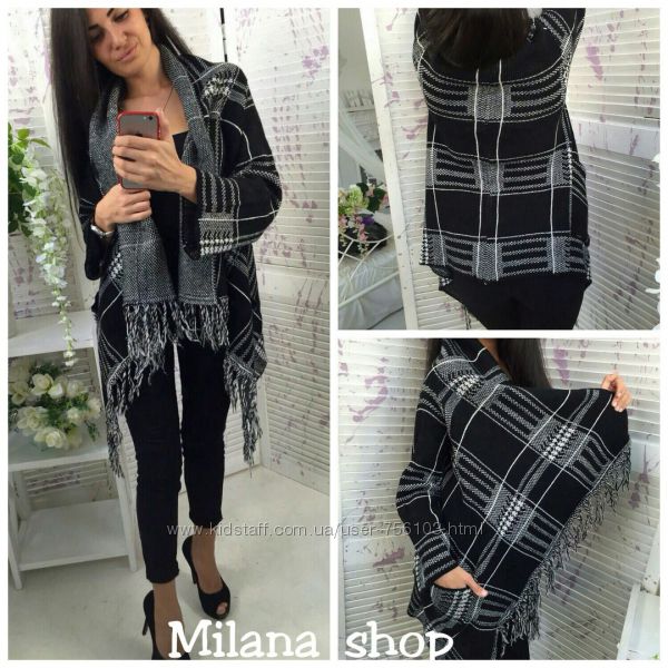 модель 902 Кардиган (пончо). Ткань - полушерсть. Модель двусторонняя, отделка - стрейч-бейка. Принт клетка. Рост модели 1.74. Цвета: 90210 - бежевый, 90220 - чёрный, 90230 - пудра. размеры: 1 (42-46 универсал), 2 (46-52 универсал)