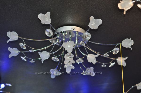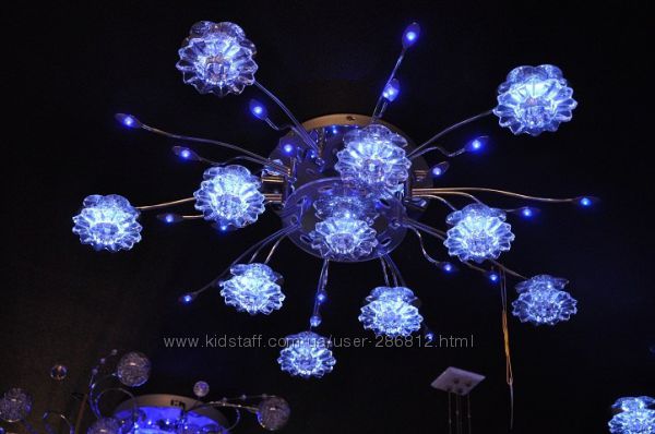 Люстра 637321. 21 лампочка, три режима света, 5 режимов подсветки: красная, синяя, сиреневая, потом эти три цвета меняются либо плавно переливается . Цена 3300грн.