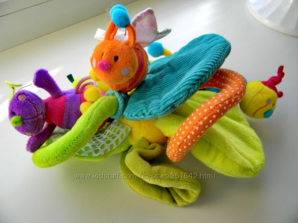 ПРОДАНА шикарная погремушка французской марки Lilliputiens зеркало шелестит,гусеница погремушка с колечками,пчелка пищалка с шелестящими крылышками, паучок оттягивается и притягивается на вибрирующей штучке,20см в диаметре-199грн.