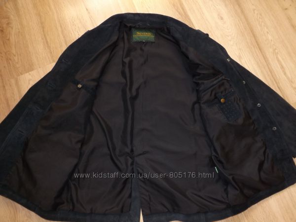 Дуже гарно дивиться приблизно на ріст 1,75м. Розмір L. Піджак замшевий, в дуже хорошому стані. Спереді є два робочих кармани. В середині є три кармани.Привезено з Європи. Колір-темно-синій.