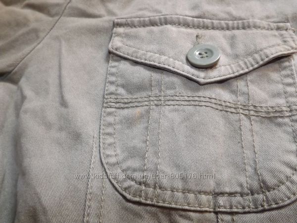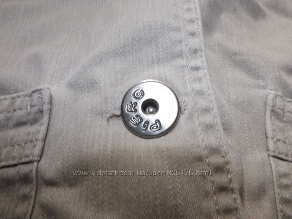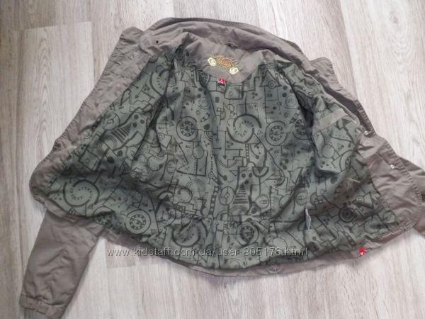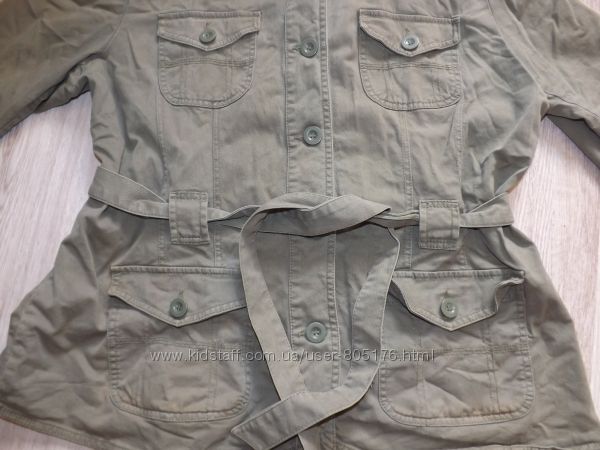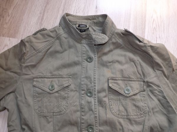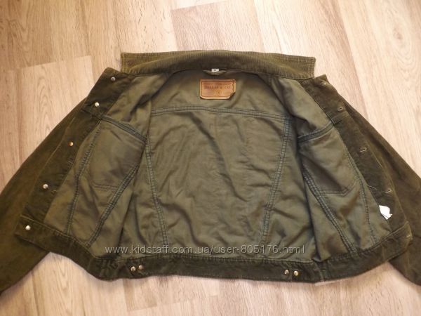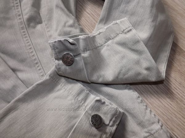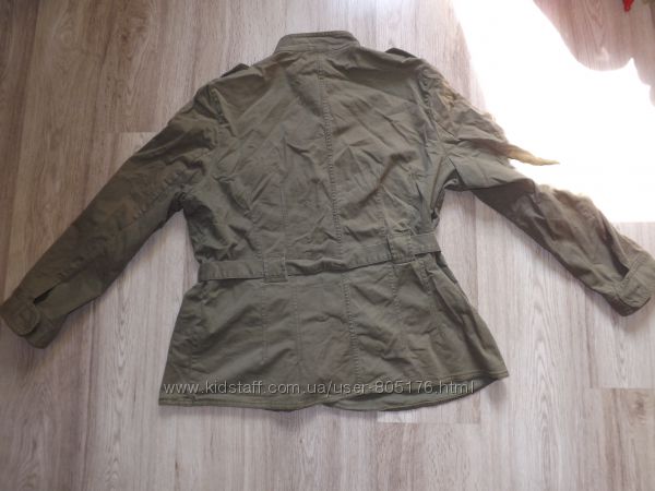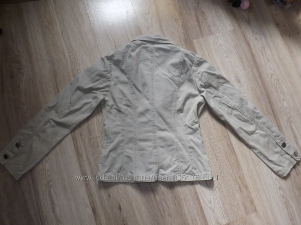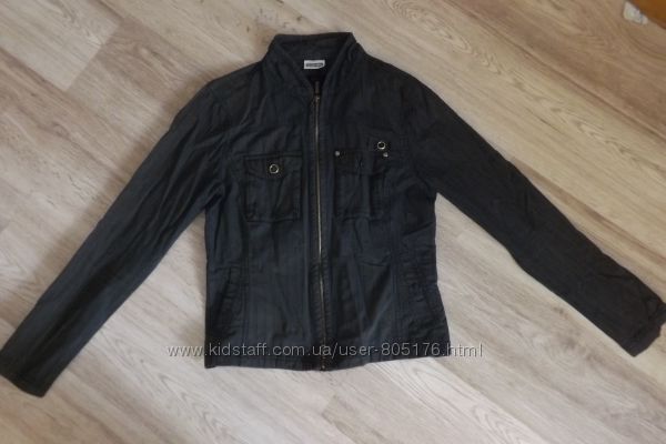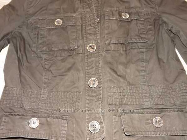 Курточка без підкладки. Є чотири робочі кармани. Не порвана, але є легко виражені плямки. На фото не всі. Склад:97% cotton, 3% elastan. Верх подібний на джинс.Колір хаккі. Всі питання, до покупки.