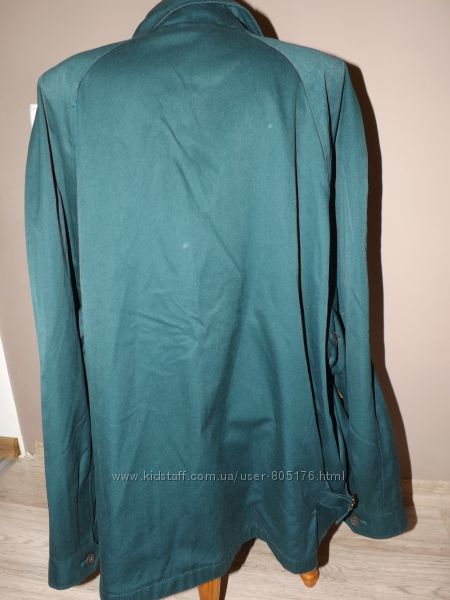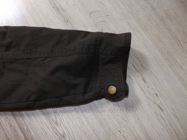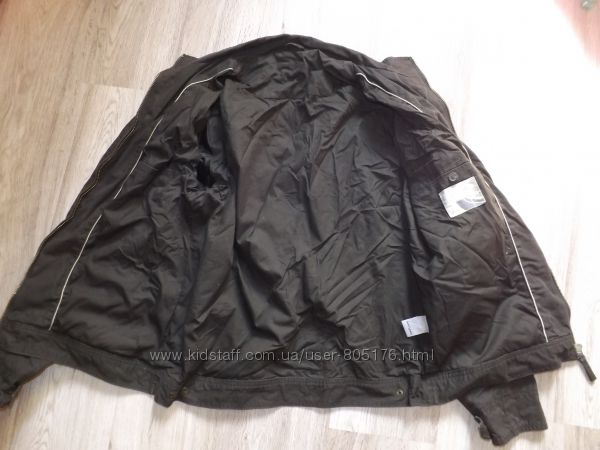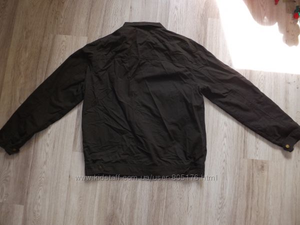 В середині є два внутрішніх кармани. Підкладка із тканини. Спереді є три робочих кармани.Колір темно-коричневий. Стан не поганий. На закінченнях курточки трішки посвітліла тканина, див.фото. Склад 100% cotton.
