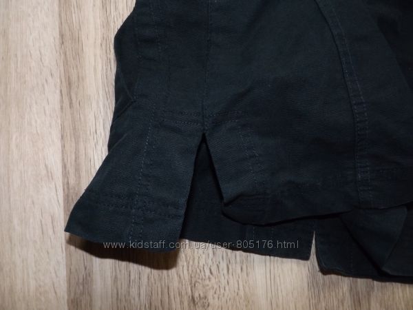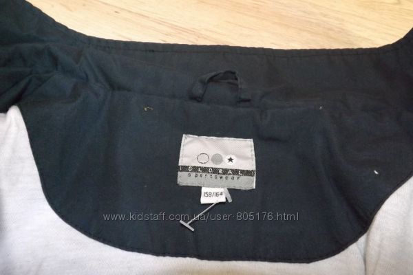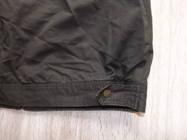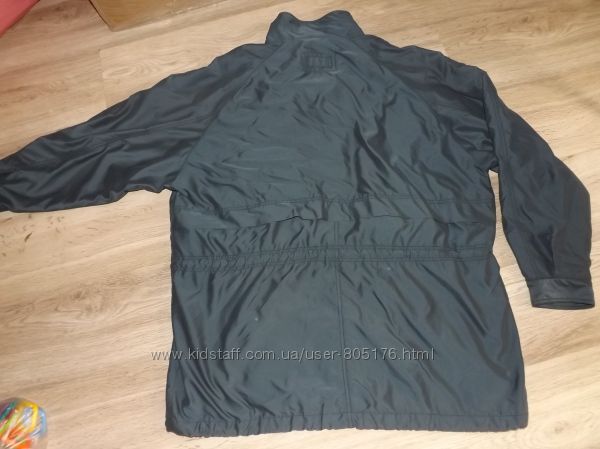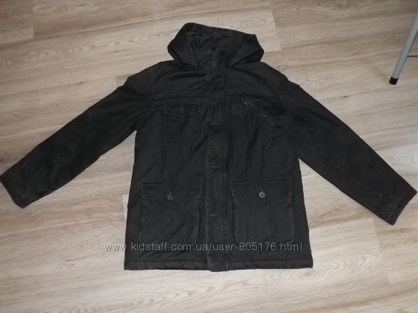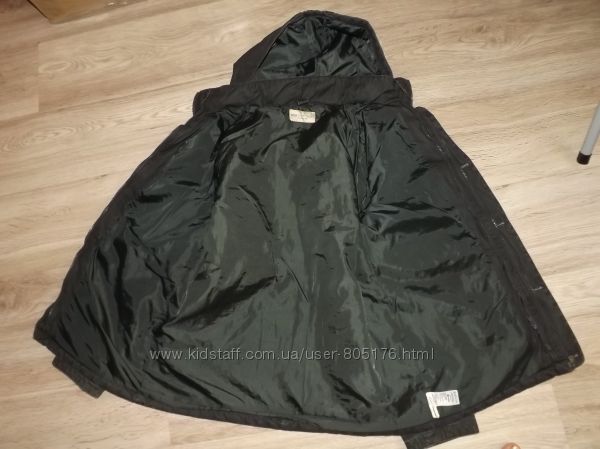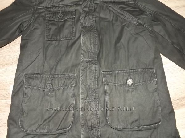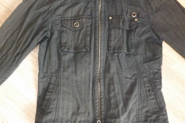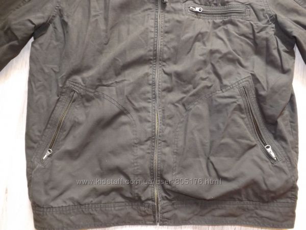Розмір пише, що на 13-14 років. Орієнтуйтесь по замірах. Стан не поганий. Колір чорний, із сірим відтінком, по всій курточці, такі ніби сірі потертості, на фото трішки видно. Верх курточки 100% cotton. Середина 100% polyester. Застібається на замок і гудз