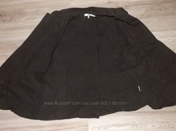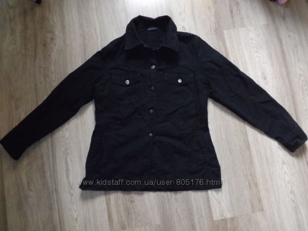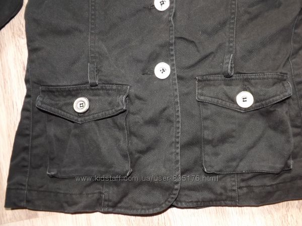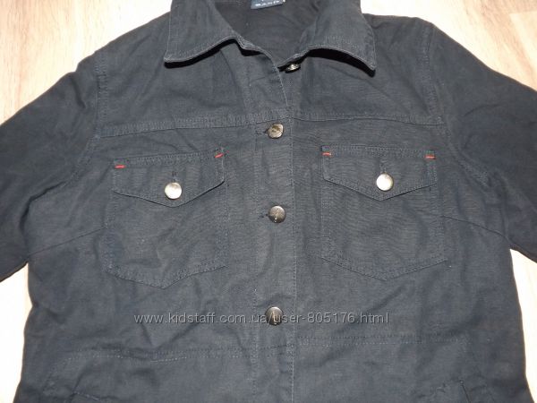 Піджачок джинсовий. В середині ще є підкладка із тканини. Склад: 100% cotton.Колір чорний. Спереді є два робочих кармани. Дефекти: на воротнічку є дві невеличких затяжки, і відсутній один гудзик, на рукаві. Привезено з Європи.
