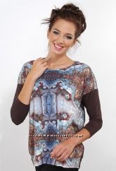 Оригинальная блузка из мягкой вискозы. Спинка и рукава - однотонные, впереди - рисунок. Состав: вискоза 96%, эластан 4%. Размер примерно на наш 50-52-54. Цена 220грн.