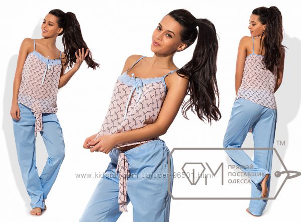 Модель № : 8414 Цена: 460 грн Размеры: S-M, M-L Ткань: вискозный шифон, низ стрейч-поплин Длина: верх 58 см, штаны 84112 см