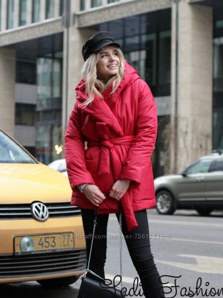Зимний,теплый пуховик из плащевки. Утеплитель пышный синтепон 200й плотности. Спущенный рукав,два накладных кармана,объемный шалевый капюшон. Изделие застегивается поясом. Расцветки: красный,черный,асфальт,горчица,электрик. Размерная сетка: S, M, L