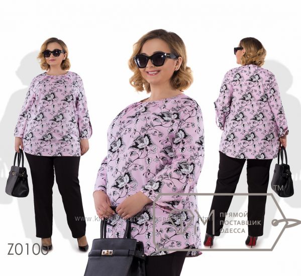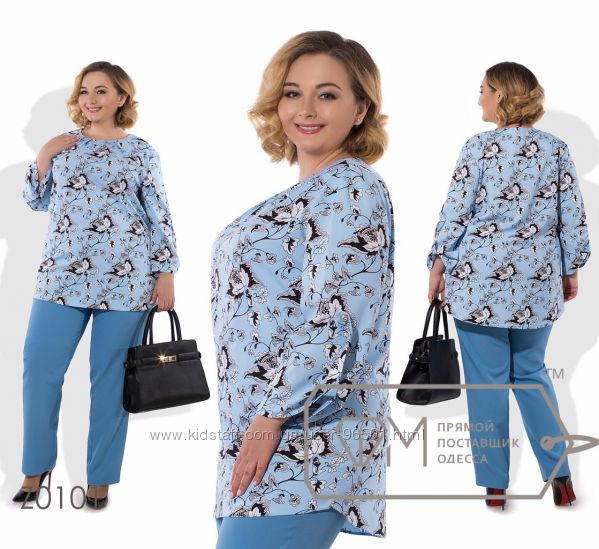 Модель № Z0100 Цена: 600грн Размеры: 56-58, 60-62 Ткань: блуза - вискоза, брюки - костюмка Длина кофточки: 78см/81см Длина рукава: 45см Длина брюк: по внешнему шву - 109см, по внутреннему - 78см ( на резинке)
