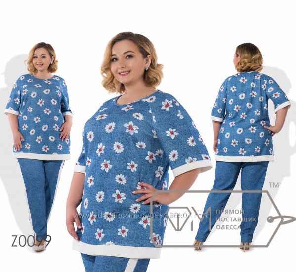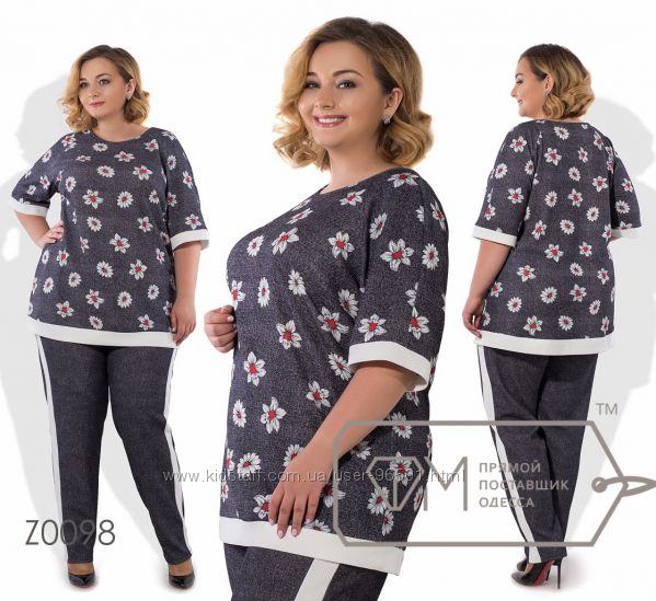Модель № X8258 Цена: 710грн Размеры: 48, 50, 52, 54 Ткань: костюмка+вышивка Длина кофты: 69см Длина рукава: 26см Длина брюк: по внешнему шву - 108см, по внутреннему шву - 78см