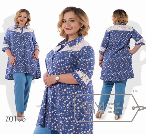 Модель № Z0104 Цена: 630грн Размеры: 56-58, 60-62 Ткань: блуза - вискоза+гипюр, брюки - костюмка Длина кофточки: 86см/90см Длина рукава: 37см Длина брюк: по внешнему шву - 109см, по внутреннему - 78см ( на резинке)