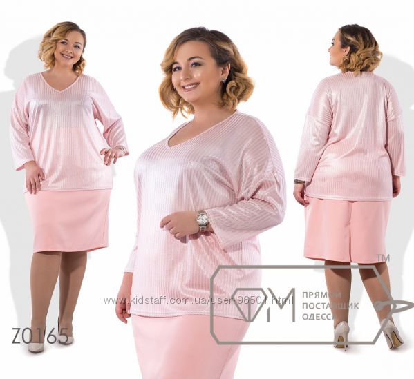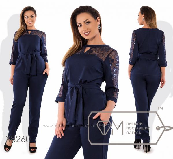 Модель № X8224 - Двойка Цена: 550грн Размеры: 48, 50, 52, 54 Ткань: кофточка - французский трикотаж, брюки - костюмка Длина кофточки: 68см Длина рукава: 42см Длина брюк: по внешнему шву - 105см, по внутреннему - 76см