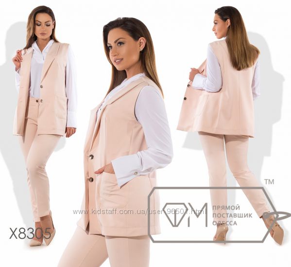 Модель № X8302 - ДВОЙКА Цена: 650грн Размеры: 48, 50, 52, 54 Ткань: креп костюмка Длина жилетки: 75см Длина брюки: по внутреннему шву: 76см, по внешнему шву - 100см