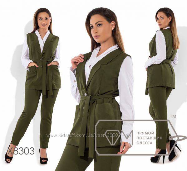 Модель № X8303 - ДВОЙКА Цена: 650грн Размеры: 48, 50, 52, 54 Ткань: креп костюмка Длина жилетки: 75см Длина брюки: по внутреннему шву: 76см, по внешнему шву - 100см