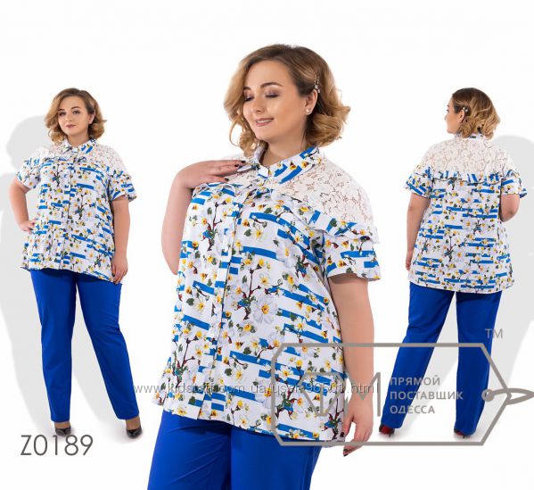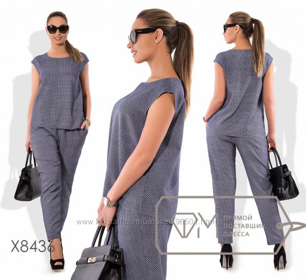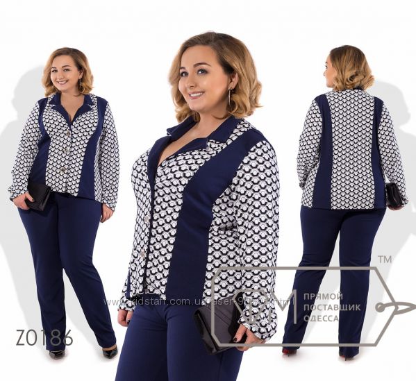 Модель № X8377 - двойка Цена: 700грн Размеры: 48, 50, 52, 54 Ткань: Алекс Длина кофточки: 77см по спинке, на запах Длина брюк: по внешнему шву - 102см, по внутреннему шву - 82см
