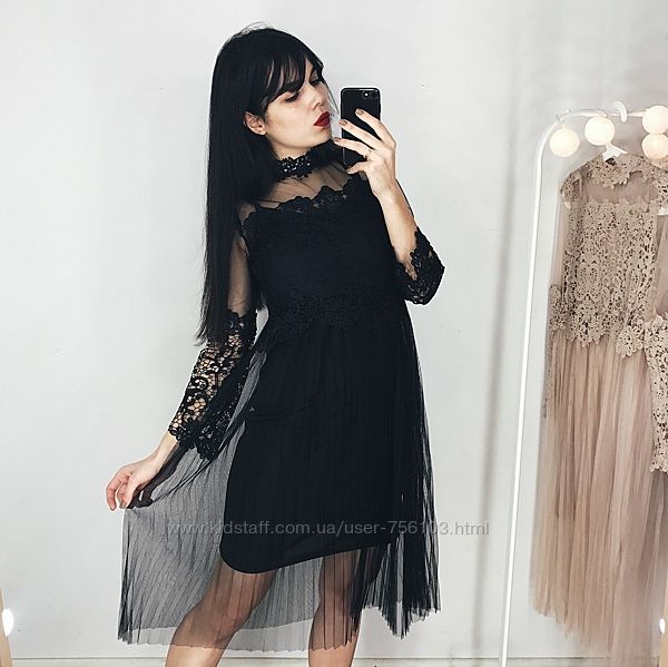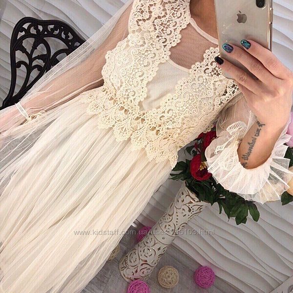 ткань фатин.декор набивное кружево в комплекте топ на бретелях (длина 90 см) размер универсальный 42/46 сзади змейка длина платья 107 см рукав 58 см цвет айвори..черный