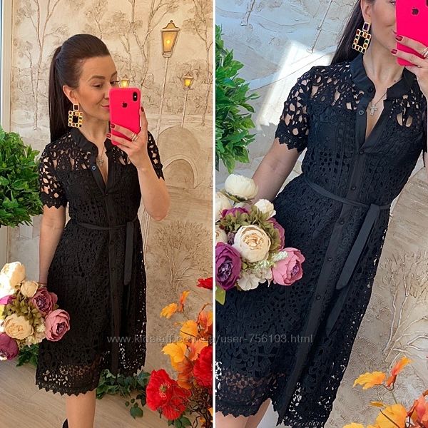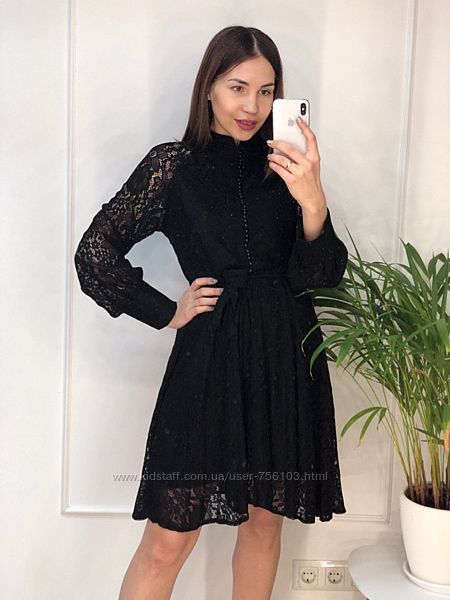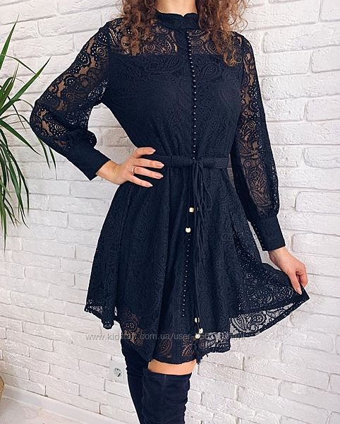 Платье на пуговках(Фабричный Китай) качество люкс ткань кружево. пояс в комплекте длина 89 см рукав 59 см размер s (42/44) цвет ЧЕРНЫЙ