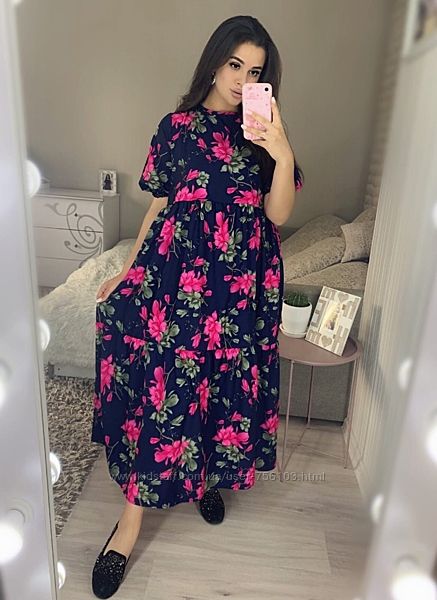 платье "Цветы " Воздушное ,очень красивое платье , украшено рюшами 😍👗спереди пуговки , на поясе резиночка Ткань софт , много Ткани размер 42-46