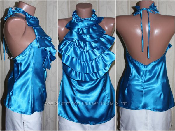 Шикарная блуза яркая бирюза атлас с жабо, yes i doo o.i.s 46/ L 150 грн ЗАМЕРЫ: ПОГруди 41, ПОТалия 38, ПОБедра 53, Дл.Изд-яот ворота по центру 58 см ткань тянется!