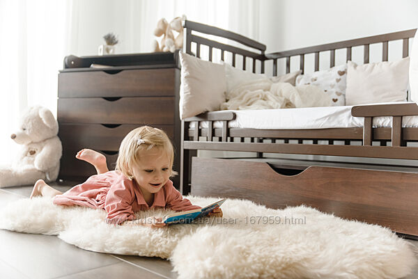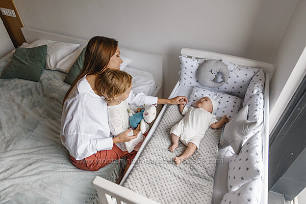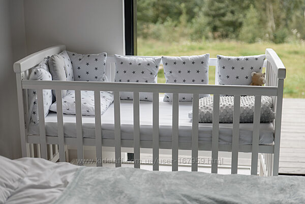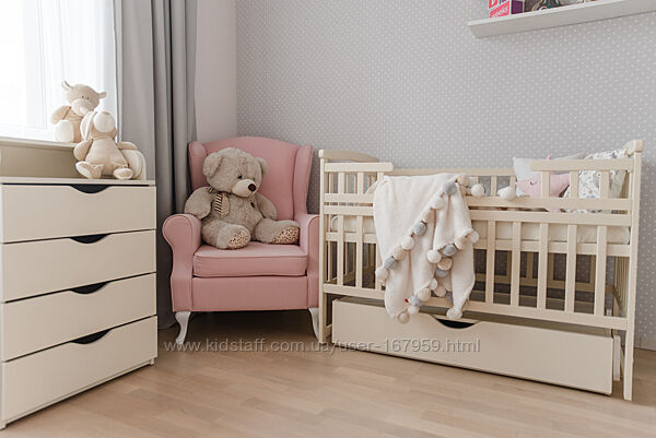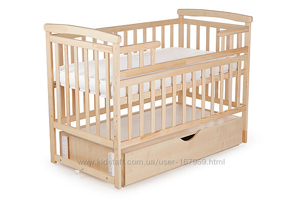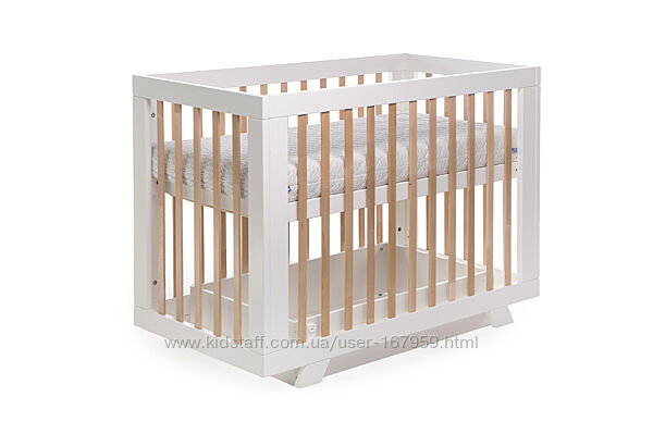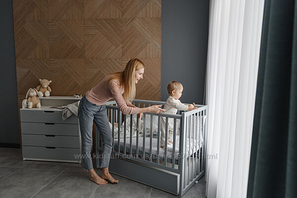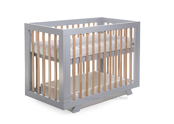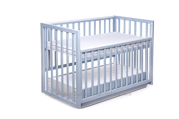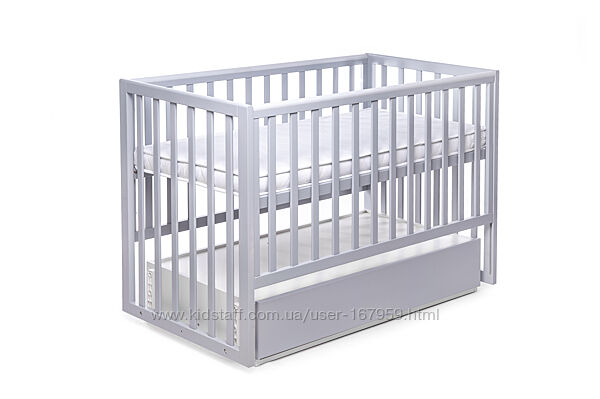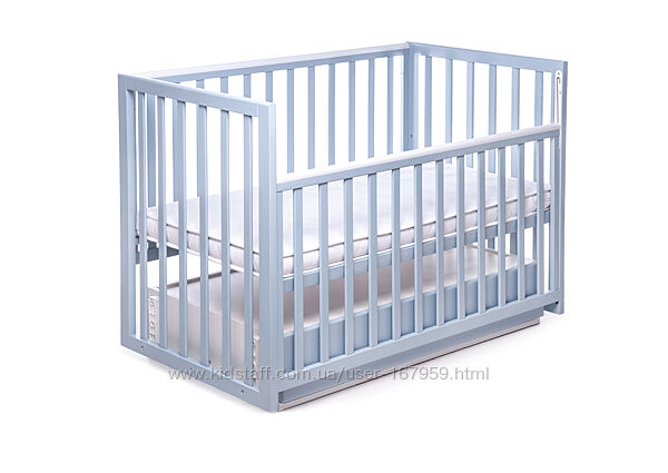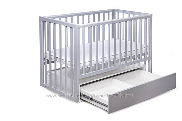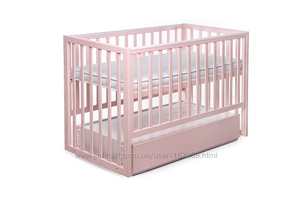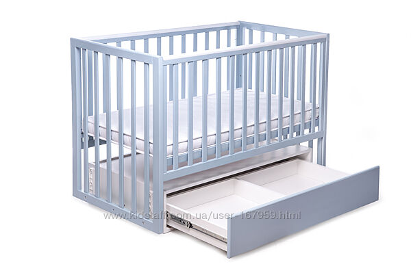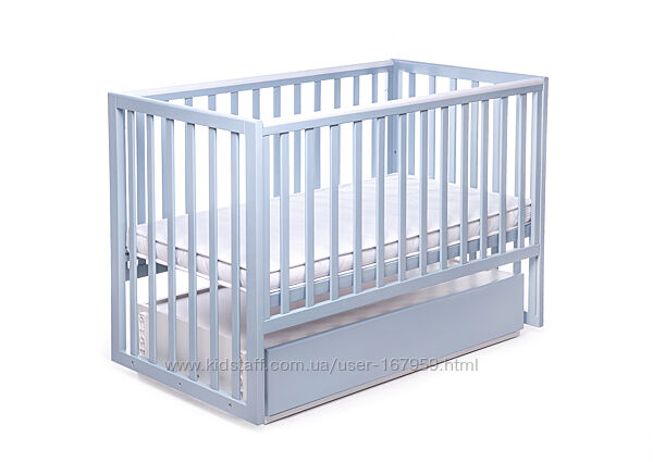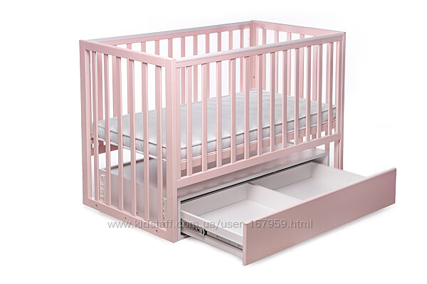 ліжечко CHARIVNE Колір: Пастельно-кораловий Пастельно-синій Пастельно-сірий Білий Розміри: зовнішній: 125х67х89 см спальнe місцe: 120х60 см ящик: 102х50х10 см упакування: 125х72х16 см вага: 32 кг
