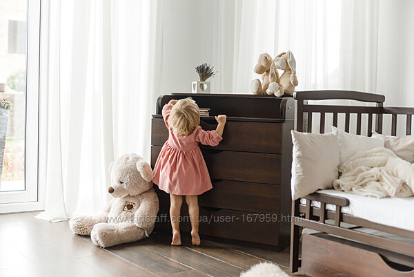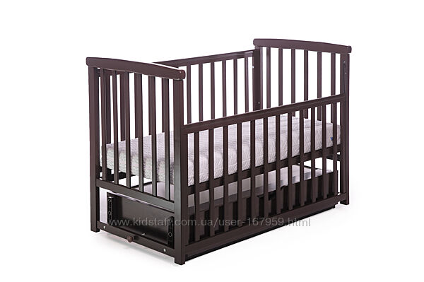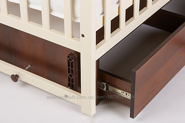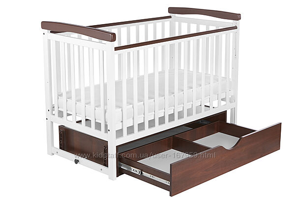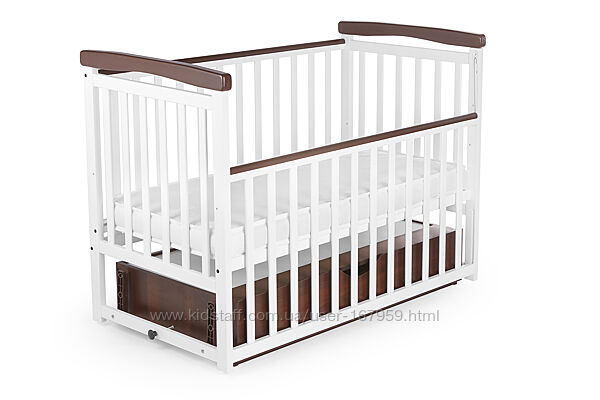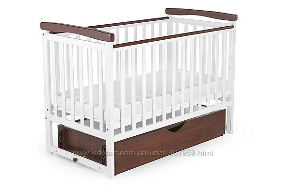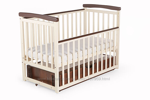 ліжечко MRIYA combi Колір: Білий+шоколад Ваніль+шоколад Розміри: зовнішній: 125х70х93 см спальнe місцe: 120х60 см висота бортиків: 83 см висота опущеного бортику: 64 см ящик: 102х50х10 см упакування: 125х72х15 см вага: 32 кг