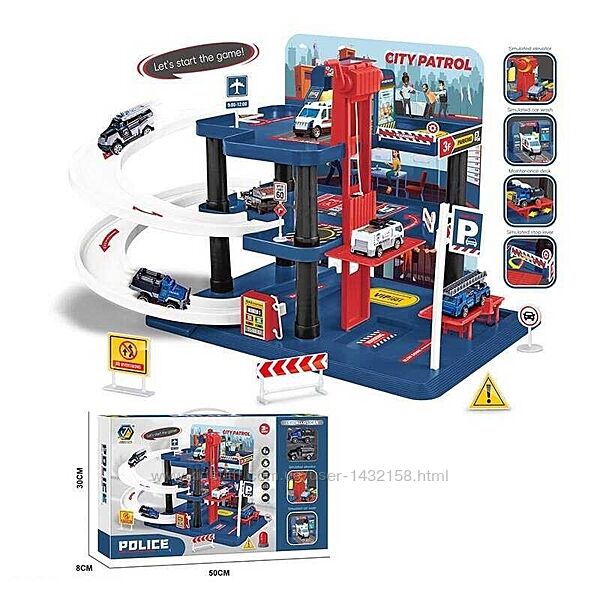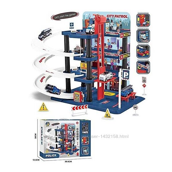 Багаторівнева конструкція. Паркінг складається з двох поверхів, які з´єднані спіральними трасами для спуску автомобілів. Функціональний механічний ліфт. Набір виконаний у поліційній тематиці. 2 металопластикові машинки та аксесуари (знаки, бар´