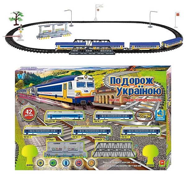 Залізниця "WToys", ОЗВУЧУВАННЯ УКР. МОВОЮ, 42 деталі, звуки, пісня, озвучені репліки, локомотив, 4 вагони, муляжі оточення, в коробці - 975