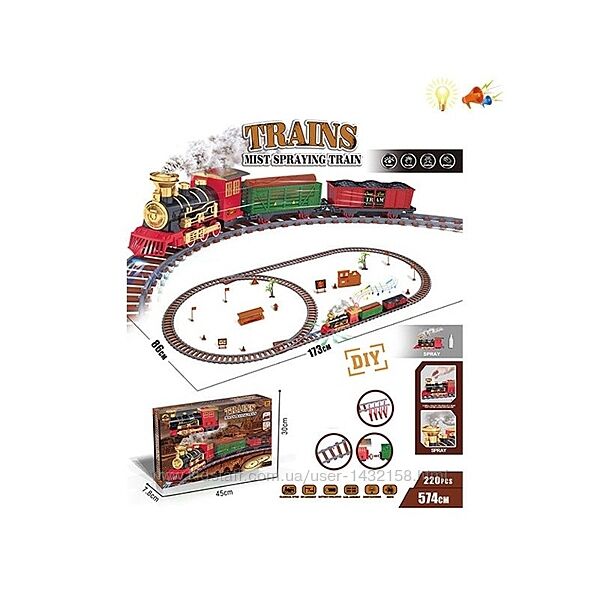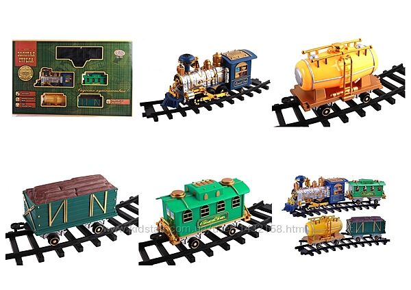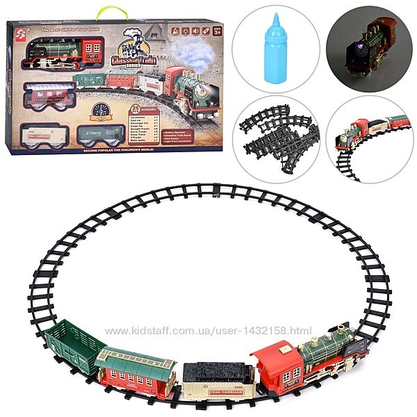Железная дорога від діам.84см / 195-89см, локомотив, 3 вагони, звук, світло, пара/дим, 2 види, 26 деталей, на бат-ці - 1035