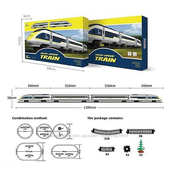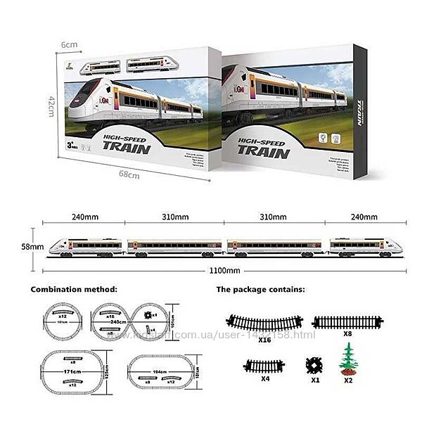 потяг з 5 вагонами, 30 елементів,автоматичний рух,присутній парогенератор,яскраве підсвічування ліхтаря під час руху,гучні тематичні звуки,загальна довжина залізничних колій 624 см - 1100