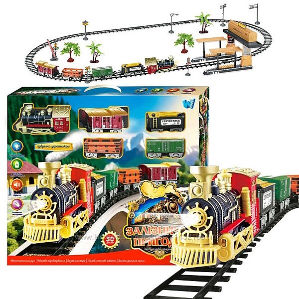 Залізничні пригоди "WToys", ОЗВУЧ. УКР. МОВОЮ, підсвічування, пісня, парогенератор, автоматичний рух, 4 вагони, декорації, платформа, в кор. - 1250
