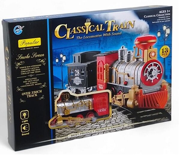 Особливості: 13 елементів. 1 вагон. При увімкненні локомотив підсвічується та програє аудіоефекти. Локомотив працює від чотирьох батарейок типу "АА" (не включені до набору). Три варіанти збірки треку. Довжина залізниці: 350 см. Набір виконано з пластику.