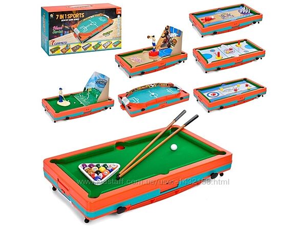 НАСТІЛЬНА ГРА 7В1,ІГРОВЕ ПОЛЕ47-26СМ, КИЙ 3ШТ,КУЛЬКИ,КЕГЛІ,ФІГУРКИ,В КОР-ЦІ,48-28-12СМ - 1000