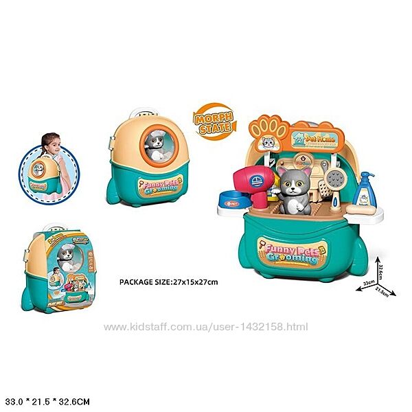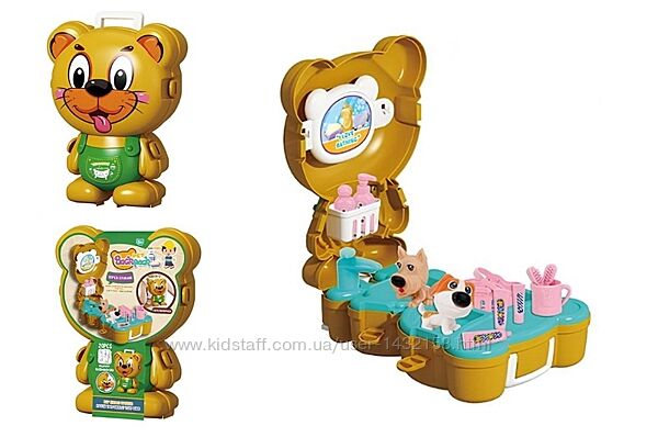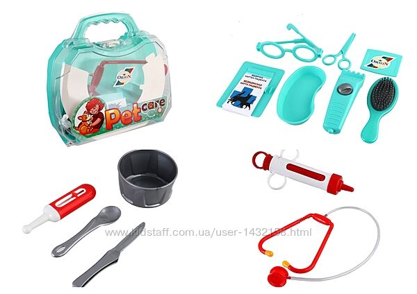 У наборі: фонендоскоп, шприц, термометр, мапа пацієнта з вкладишем, бейджик лікаря, окуляри, медичний лоток, ложечка для мікстури, скальпель, щітка, ножиці, машинка для стрижки, годівниця, комір - обмежувач, кейс. - 255