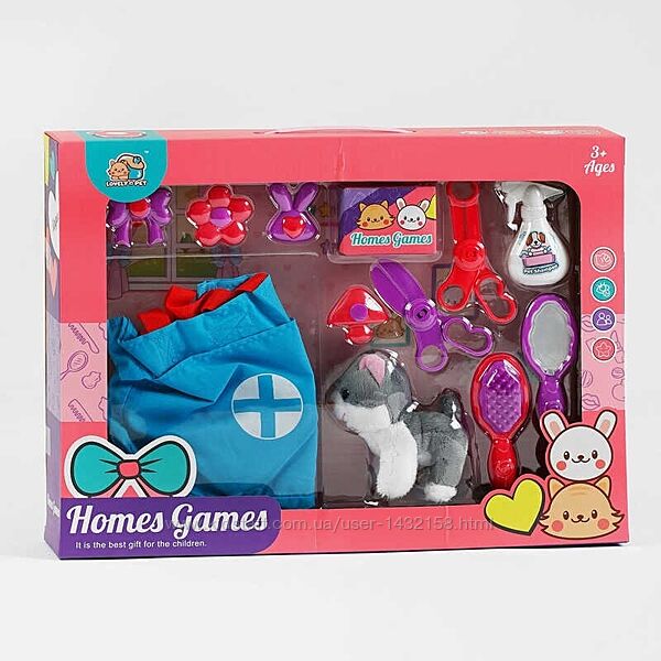 Висота цуцика - 12 см. Комплектація: собака, текстильна сумка ветлікаря, 4 резинки для волосся, щітка для волосся, люстерко, пляшка із засобами для догляду, ножиці, затискач. - 550