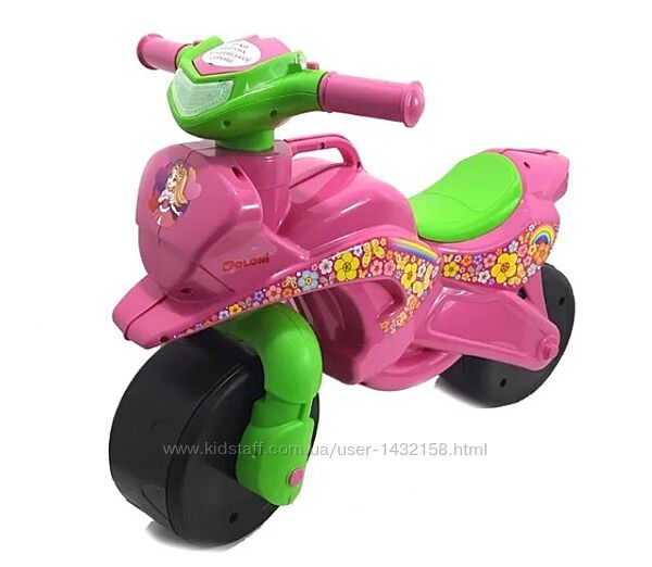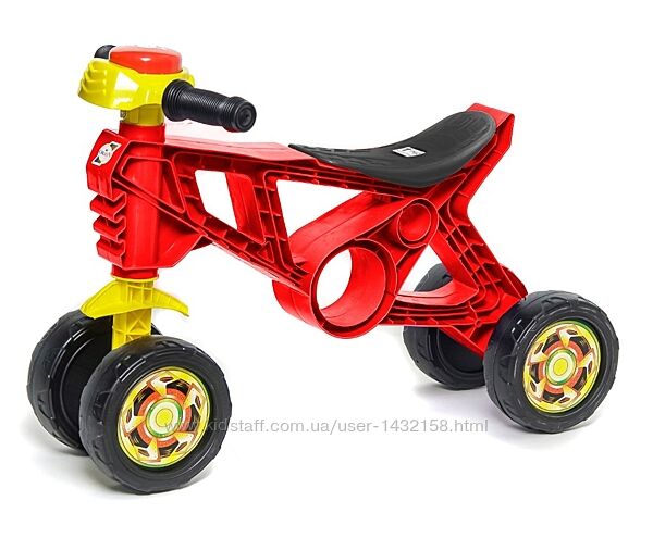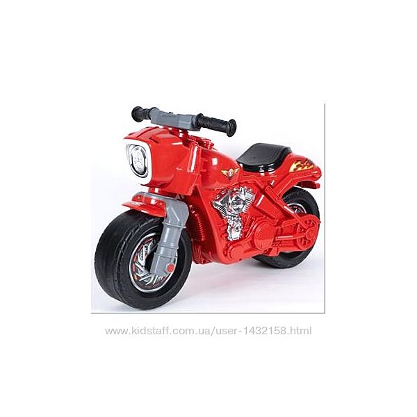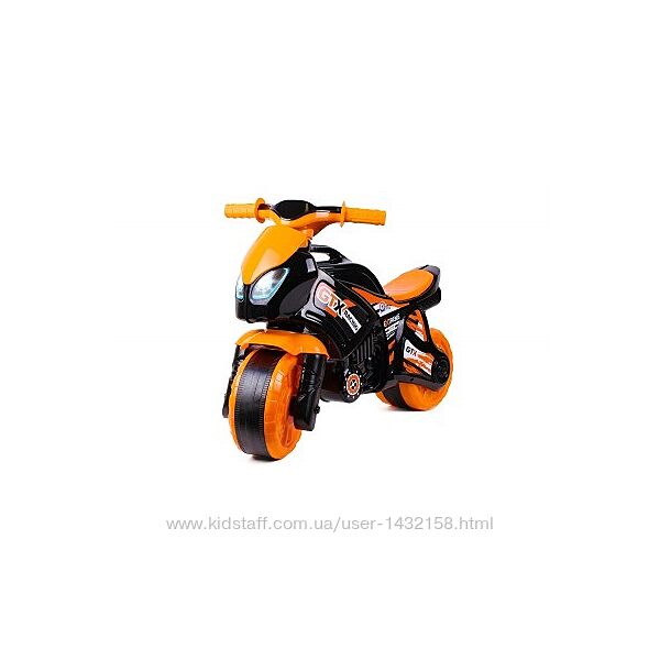 Габарити мотоцикла: 70*35*50 см Висота до сидіння: 32 см Мотоцикл виготовлений з якісного, нетоксичного пластику і пофарбований у яскраві кольори. Вага: 2.6 кг Вік: від 1,5 до 4 років Матеріал: пластик (без музики) 675