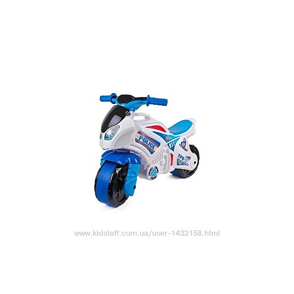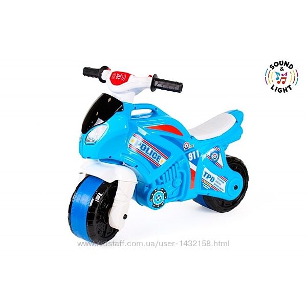 Мотоцикл-каталка с ручкой для переноски. Имеет большие колеса с протекторами, диаметр колес 21 см. "Полiцiя". При повороте руля переднее колесо тоже поворачивается. У мотоцикла удобное сиденье. Мотоцикл со звуками сирены и звуки двигателя-835