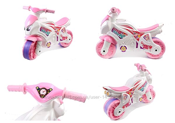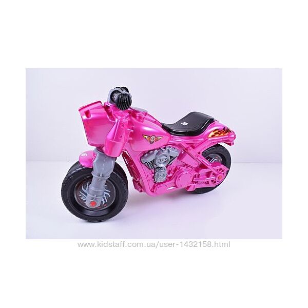 Мотоцикл розовый. Особенности: широкие устойчивые колеса диаметром 20см, удобное сиденье, переднее колесо поворачивается при помощи руля, максимальная нагрузка30кг. Вес изделия2кг. Материал пластик-785