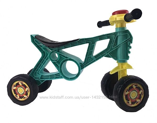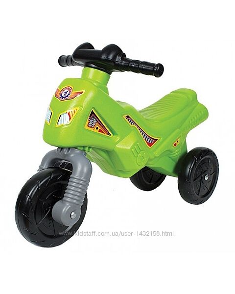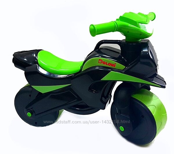 Мотоцикл зеленый Орион. Особенности:широкие устойчивые колеса диаметром20см, удобное сиденье, переднее колесо поворачивается при помощи руля, максимальная нагрузка30кг. Вес изделия2кг. Материал пластик-750