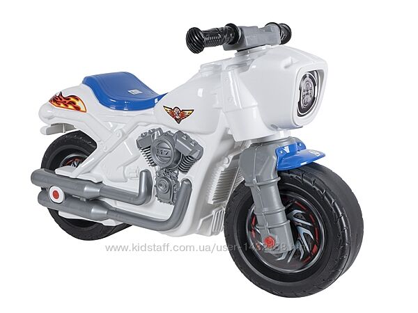 Мотоцикл белый Орион. Особенности:широкие устойчивые колеса диаметром 20см, удобное сиденье, переднее колесо поворачивается при помощи руля, максимальная нагрузка30 кг. Вес изделия2 кг. Материал-пластик-810