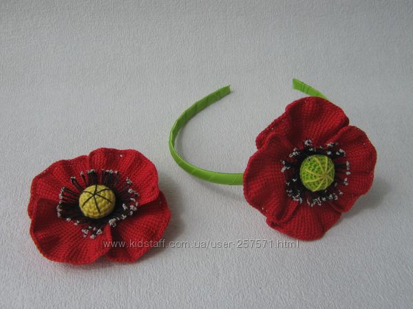 Обруч, обтянутый атласной лентой с вязаным маком. Диаметр цветка - 9см.Другие объявления продавца