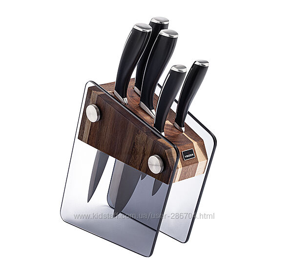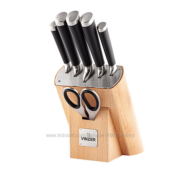 Набори ножів Vinzer — це високоякісні кухонні інструменти, які відзначаються міцністю, ергономічністю та оригінальним дизайном. Вони виготовляються з високоякісної вуглецевої або молібден-ванадієвої нержавіючої сталі, що гарантує довгу гостроту лез та стійкість до корозії. Набори часто комплектуються зручними колодами для зберігання та мають естетичну подарункову упаковку.