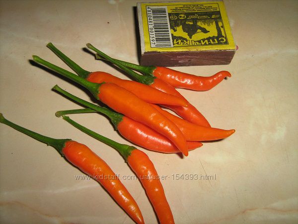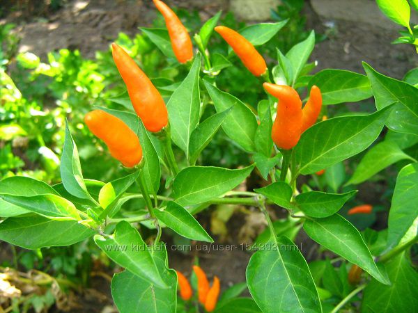 Лисенок. Умеренно острый сорт. Плоды удлиненные направлены вверх ярко-оранжевой окраски. Куст высотой до 50 см. Обильное плодоношение. Прекрасно сочетается с сортом Чудо Подмосковья и Тонким огоньком. Цена 15 грн . -10 шт